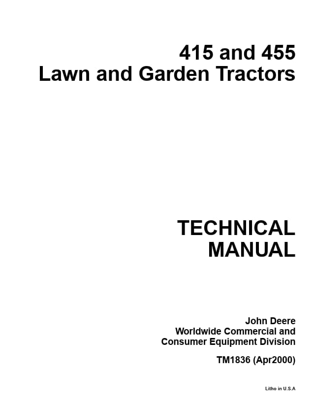Instant download John Deere 415,455 Lawn and Garden Tractor Service Repair Technical Manual! A downloadable repair manual, also termed factory service manual, is a book of repair instructions that describes the maintenance, service and repair procedures for the complete vehicle. Its a digitally delivered repair book that covers all aspects of repair.