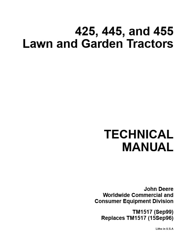 Instant download John Deere 425/445/455 Lawn and Garden Tractor Service Repair Technical Manual! A downloadable repair manual, also termed factory service manual, is a book of repair instructions that describes the maintenance, service and repair procedures for the complete vehicle. Its a digitally delivered repair book that covers all aspects of repair.