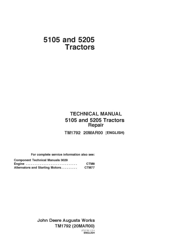 Instant download John Deere 5105 and 5205 Tractor Service Repair Technical Manual! A downloadable repair manual, also termed factory service manual, is a book of repair instructions that describes the maintenance, service and repair procedures for the complete vehicle. Its a digitally delivered repair book that covers all aspects of repair.