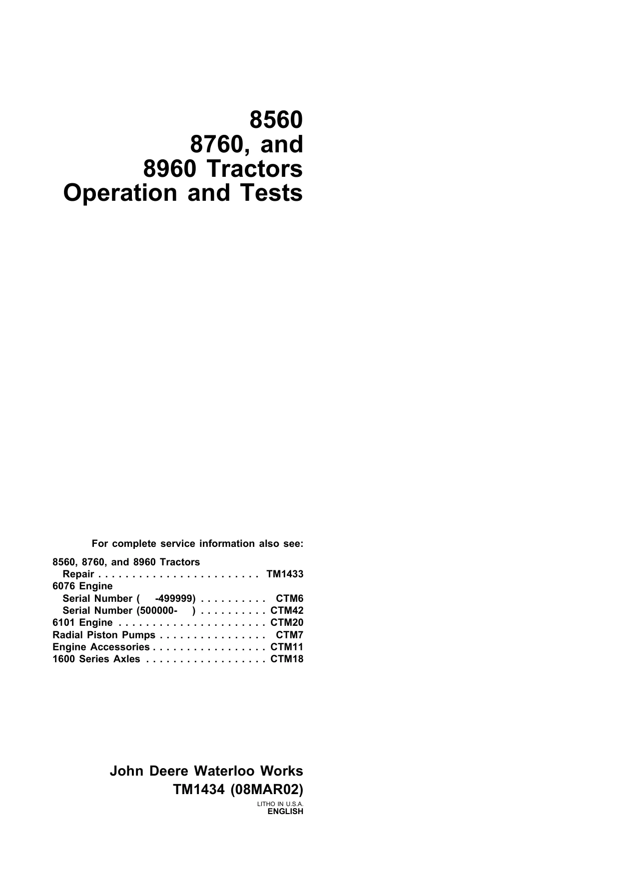 Instant download John Deere 8560 8760 8960 Tractors Operation and Tests Manual!
