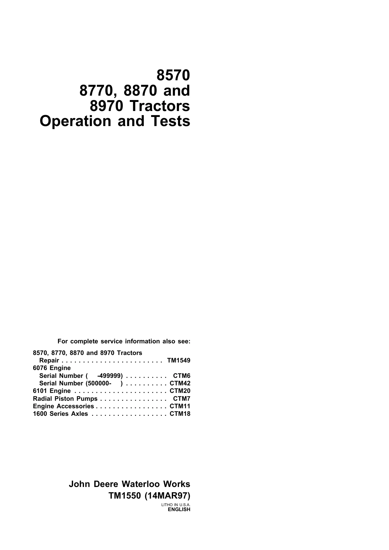 John Deere 8570 8770 8870 8970 Tractors Operation and Tests Manual
