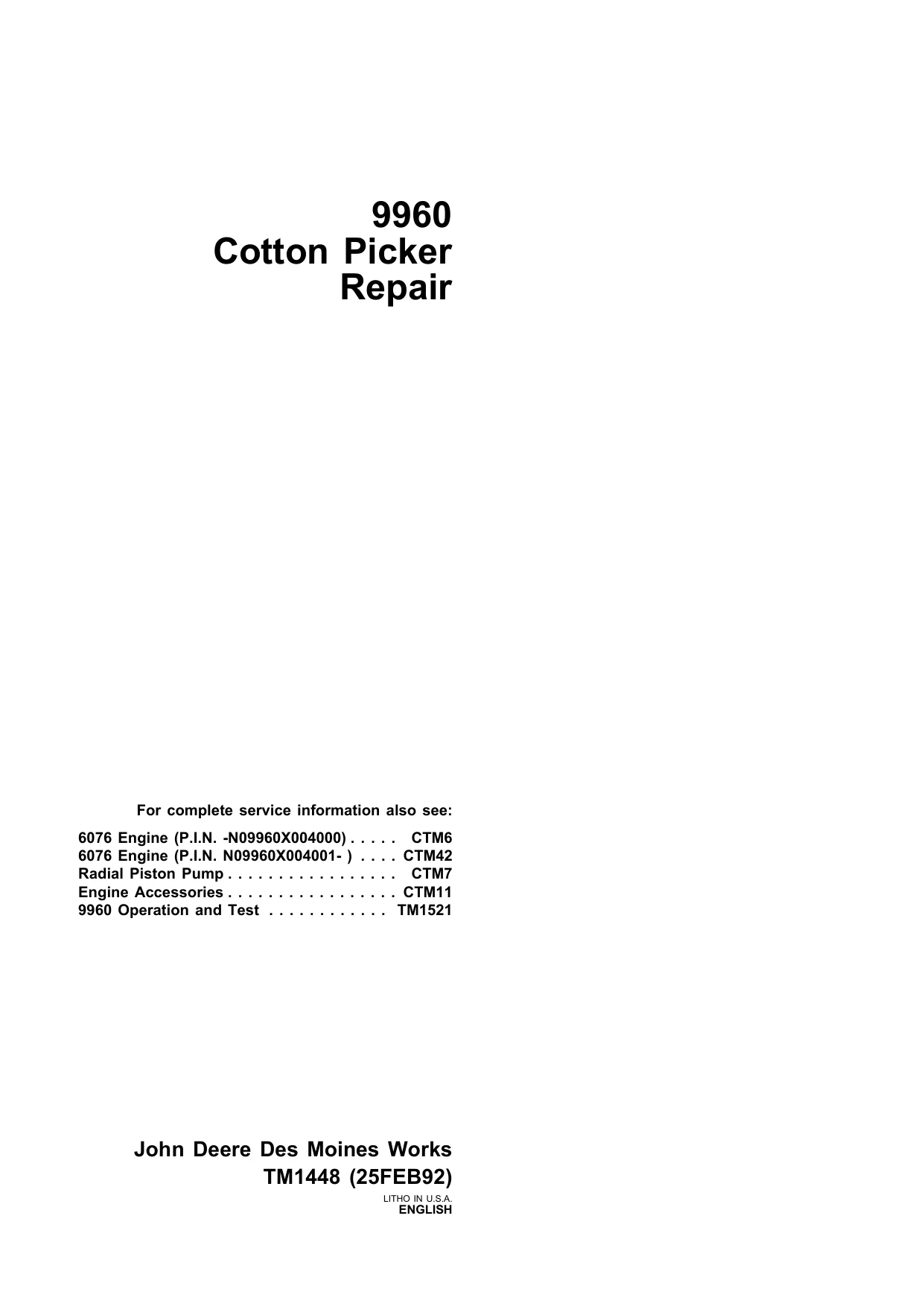 Instant download John Deere 9960 Cotton Picker Service Repair Manual!