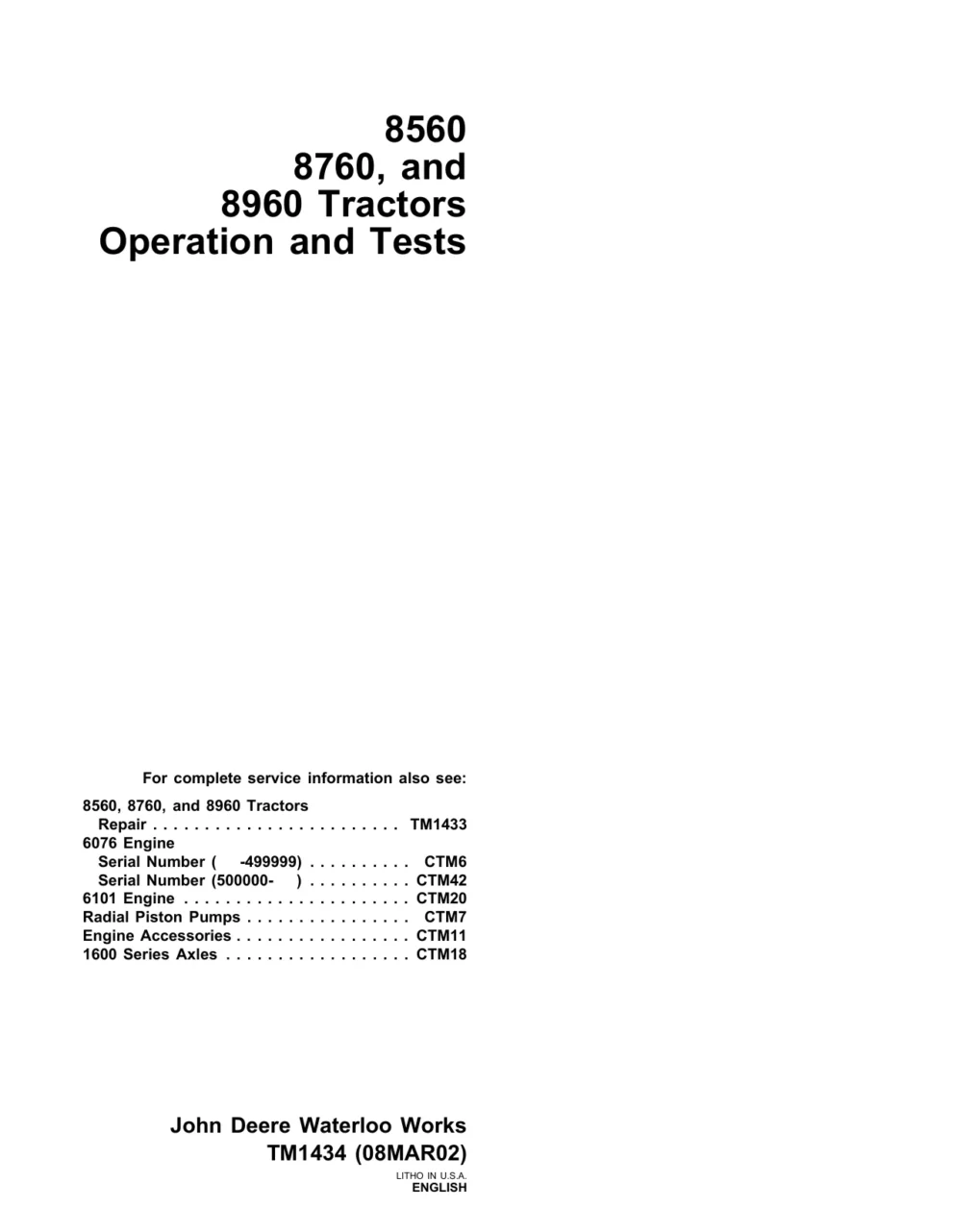 John Deere Articulated Tractors 8560 8760 8960 4WD Diagnosis and Tests Service Manual TM1434