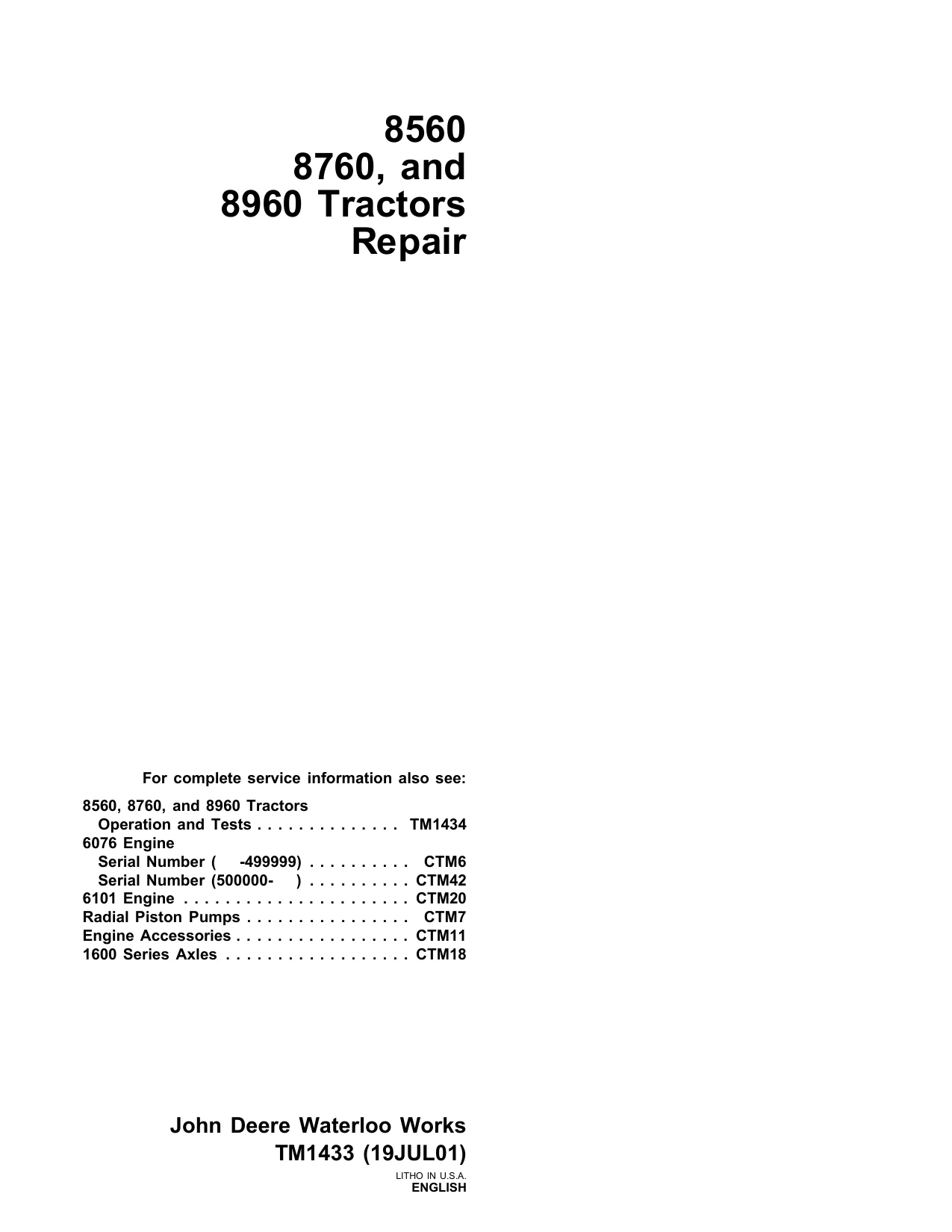 John Deere Articulated Tractors 8560 8760 8960 4WD Repair Manual TM1433
