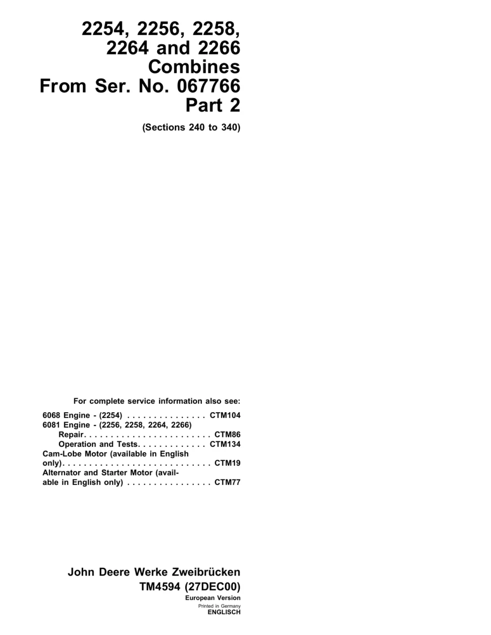 John Deere Combine 2254 2256 2258 2264 2266 tm4594 Technical Manual