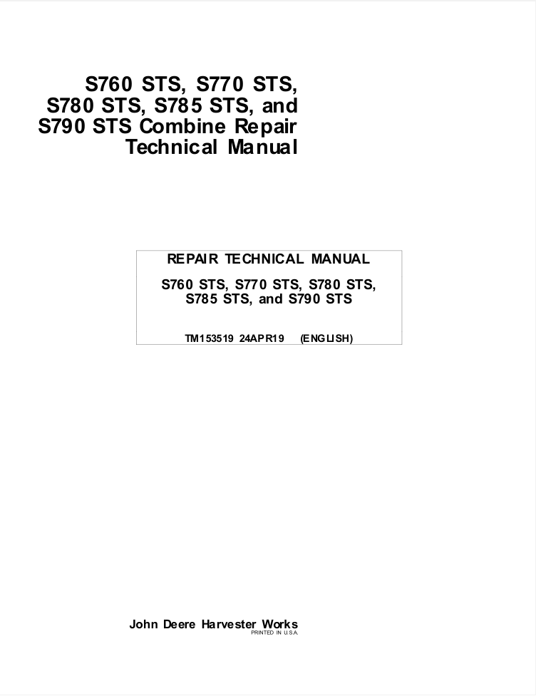 John Deere Combine S760 STS S780 S785 S790 tm153519_19_24apr19 Technical Manual