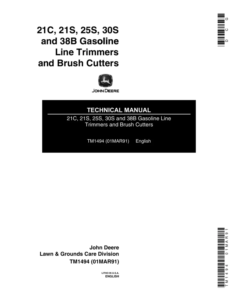 John Deere Gasoline Trimmers Brush Cutters 21c 21s 25s 30s 38b tm1494 Technical Manual