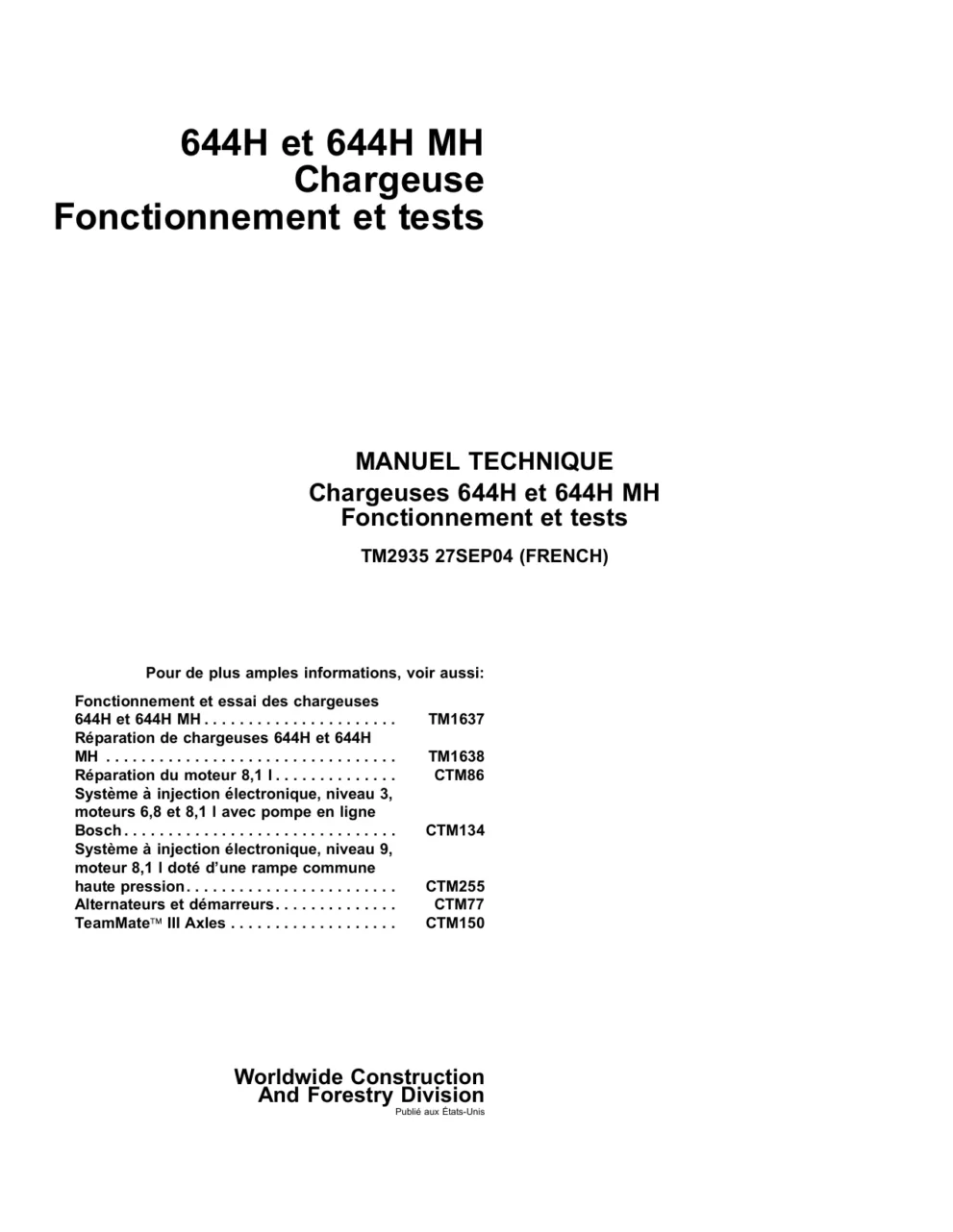 Instant download John Deere Loaders 644H 644H MH TM2935 Technical Manual (French)!