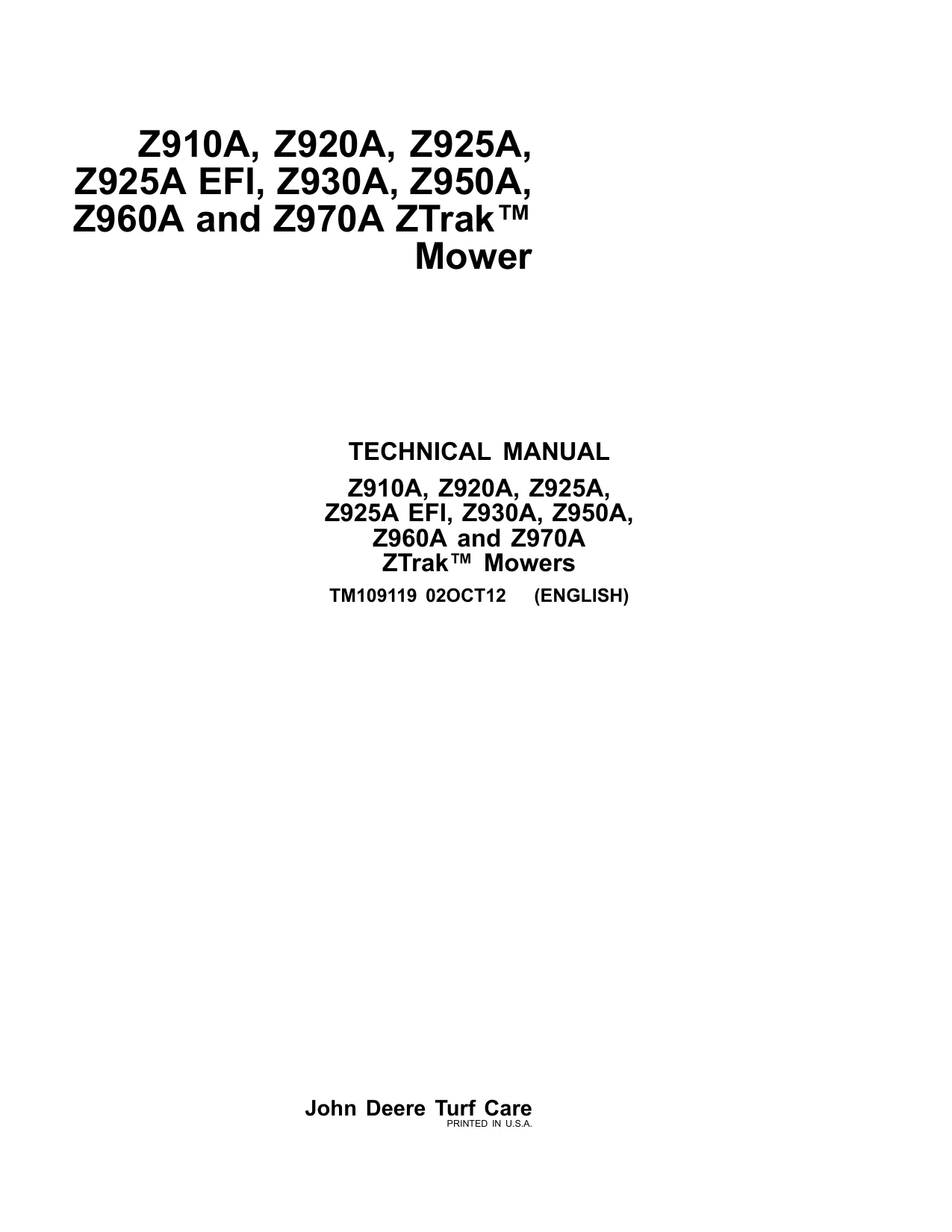 Instant download John Deere Mowers Z910A Z920A Z925A Z925A Z930A Z950A Z960A Z970A Technical Manual!