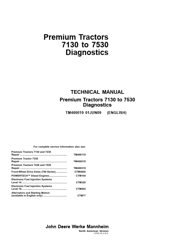 Instant download John Deere Premium Tractors 7130 to 7530 Diagnostics Service Repair Technical Manual TM400019!