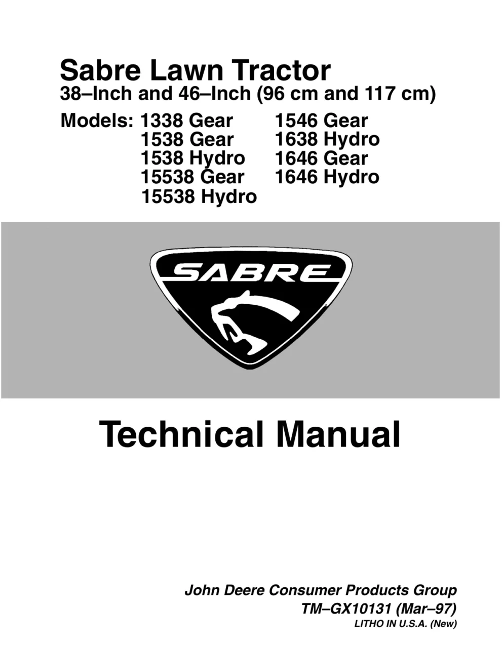John Deere Sabre Lawn Tractor 1338 1538 15538 1546 1638 1646 TM-GX10131 Technical Manual