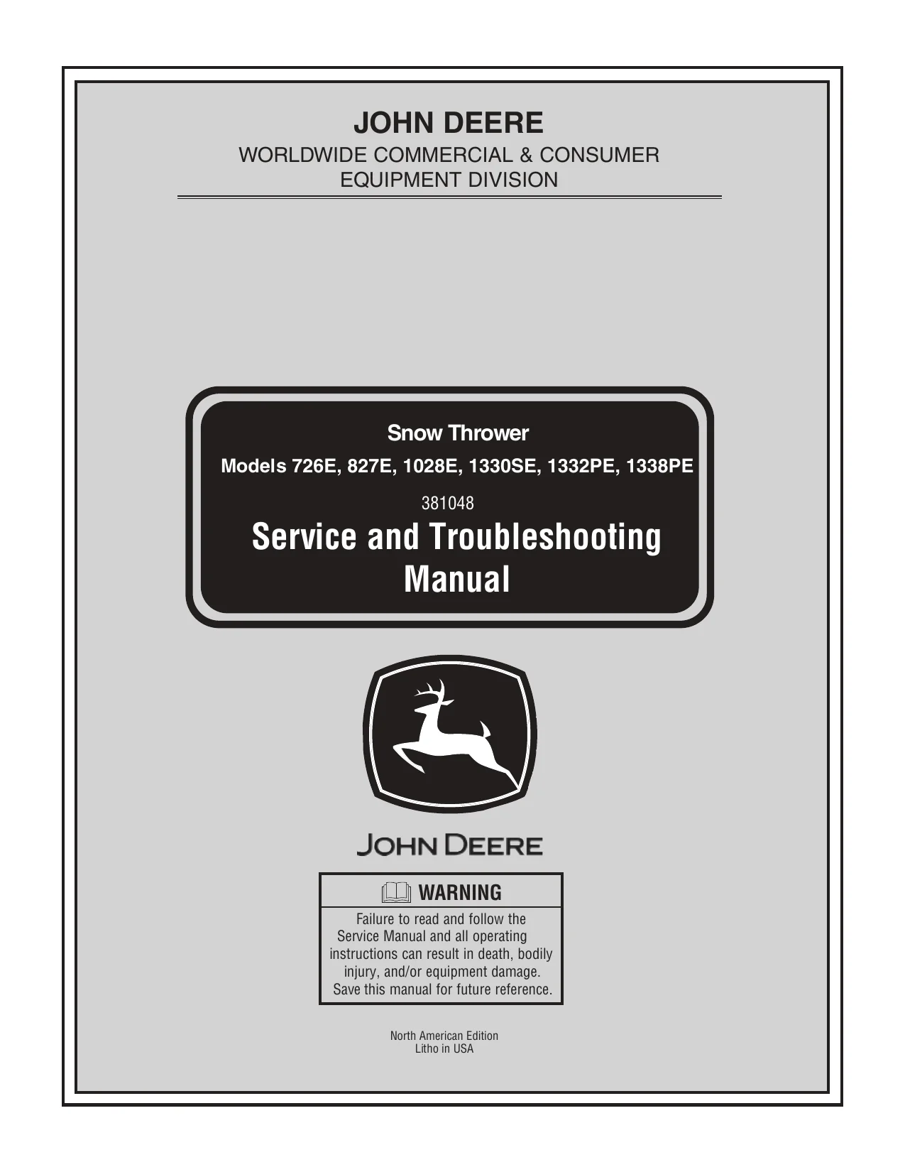 Instant download John Deere Snow Thrower 726E 827E 1028E 1330SE 1332PE 1338PE 381048 Technical Manual!