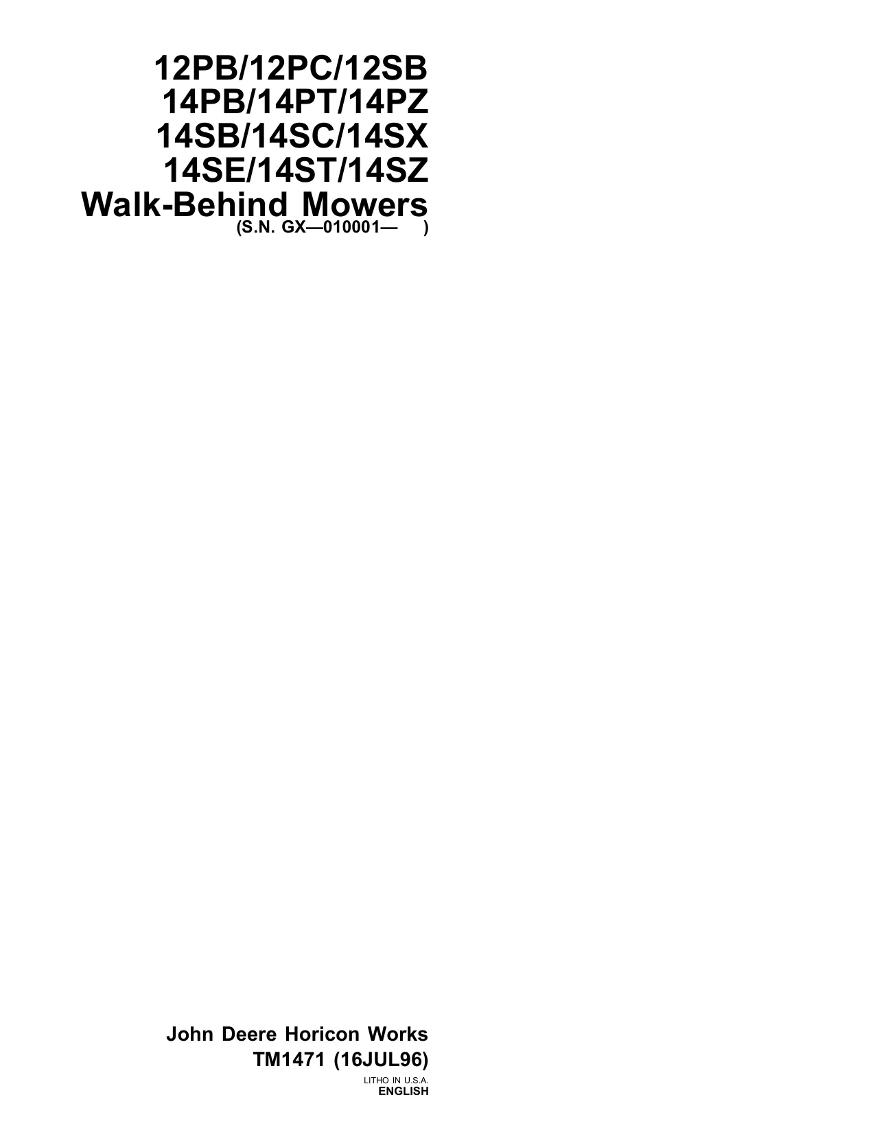 Instant download John Deere Walk Behind Mowers 12PB 12PC 12SB 14PB 14PT 14PZ 14SB 14SC 14SX 14SE 14ST 14SZ tm1471 Technical Manual!