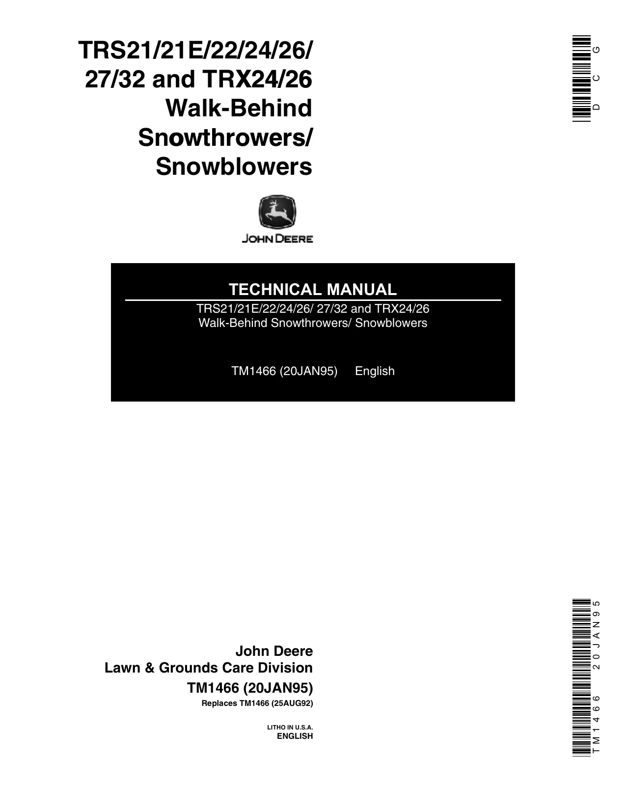 John Deere Walk Behind Snowblowers TRS21 21E 22 24 26 27 32 TRX24 26 tm1466 Technical Manual